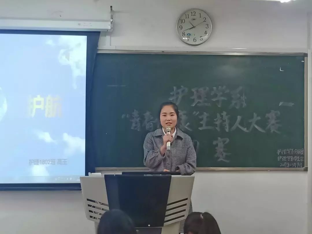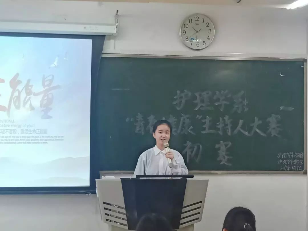 活动开始,各组选手依次上台表演,同学们精神饱满,姿态得体大方。比赛中,选手们自信十足、言语慷慨激昂,描述了对“青春、健康”的理解,内容紧扣主题,与在场观众产生了共鸣,让所有人体会到青春与健康,博得了台下观众的阵阵掌声。尤以盖薇的一段话:人世间,再也没有比青春更可贵的东西,然而青春也最容易消逝。最可贵的东西却不甚为人们所爱惜,最易消逝的东西却在促使它的消逝。谁能保持永远的青春,便是伟大的人。令人深思。另外,各位选手关于“我的家乡”话题精彩的临场发挥,不仅为比赛增加了更多的花絮,更将现场的气氛一次又一次的推向了高潮。最终评选出,盖薇、祁硕坤和马一鸣同学将代表护理学系参加决赛。