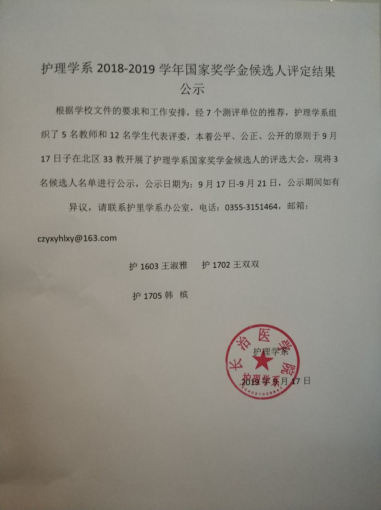 大会最后,主持人公布了评审结果。分数排名前三的1603班王淑雅,1706班韩槟,1702班王双双同学荣获了代表护理学系参与校级2018~2019学年国家奖学金竞选的资格。