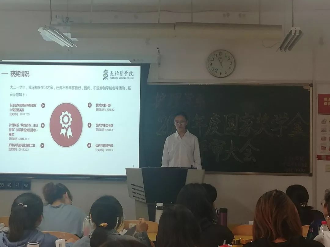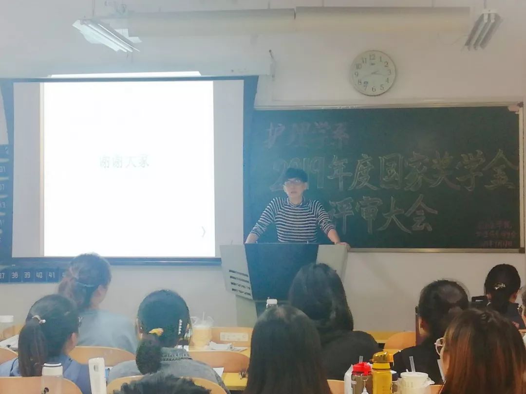 大会伊始,张晓霞老师强调了本次国家奖学金评审的细则和注意事项。本次评审大会将从七名候选同学中选出三名同学代表护理学系参加校级国家奖学金的竞选。随后七名参选同学依次上台,结合PPT做竞选演讲。他们分别从个人基本信息,学习成绩,思想政治,素质拓展,社会实践等方面介绍自己。作为年级中的佼佼者,他们不仅在成绩上出类拔萃,思想道德参加各种活动并取得了优秀成绩,更积极投身于各种志愿活动,挤出课余时间为社会奉献自己的力量。