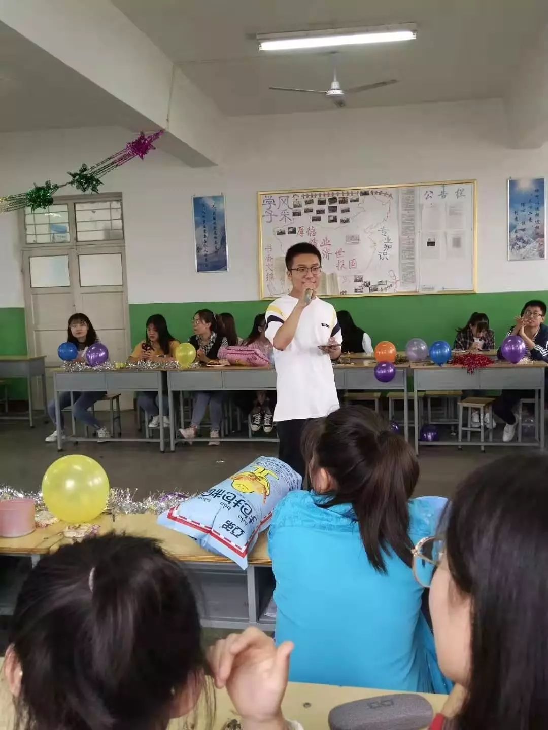 桌上五颜六色的气球洋溢着节日的氛围,随后活动在女生部兰雪彦和王宁为大家带来的歌曲《那么骄傲》中拉开序幕,带动了全场气氛。之后文艺部龙舟、顾悦同学为大家带来了《年少有为》,借此对全场进行祝福,希望大家不要在自己应该奋斗的年龄,选择安逸,走出一条属于自己的道路。