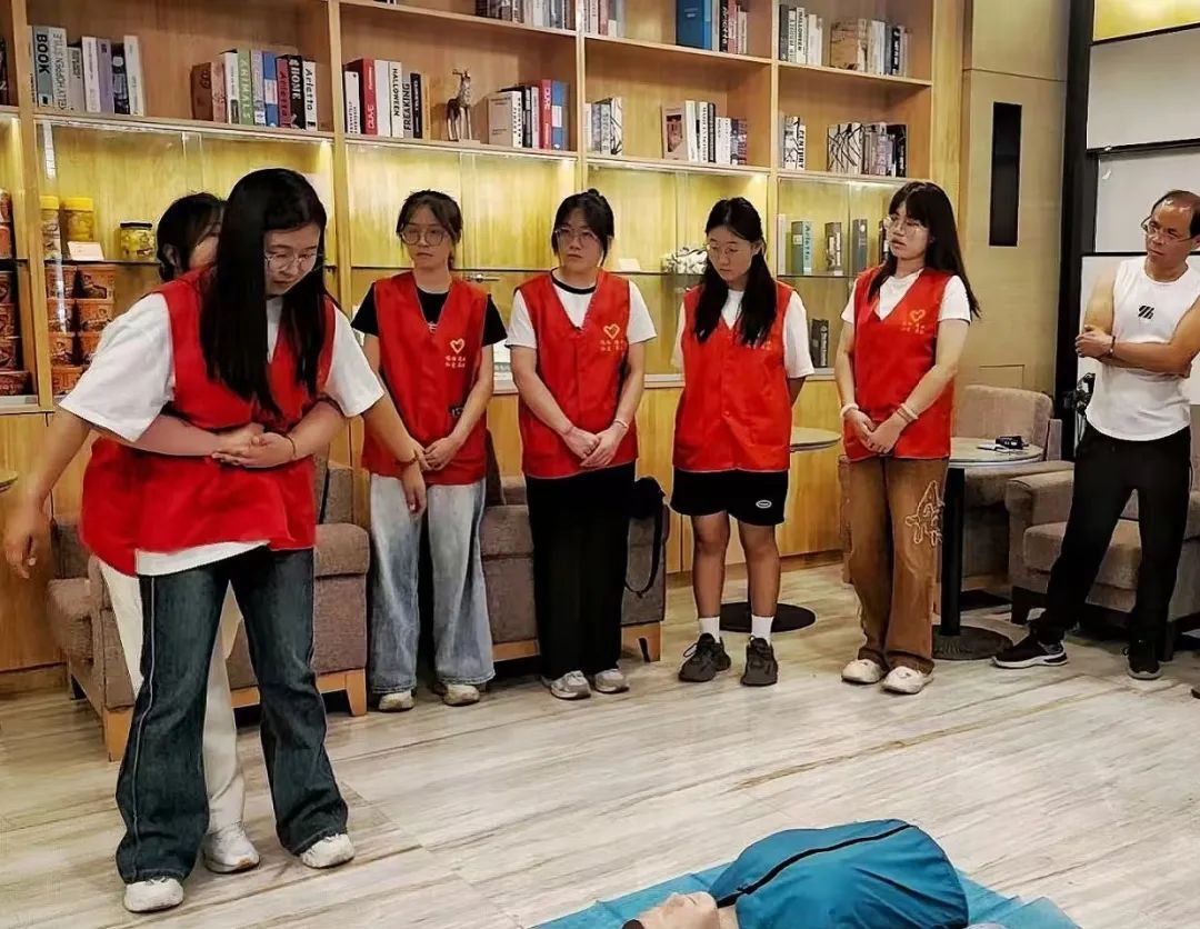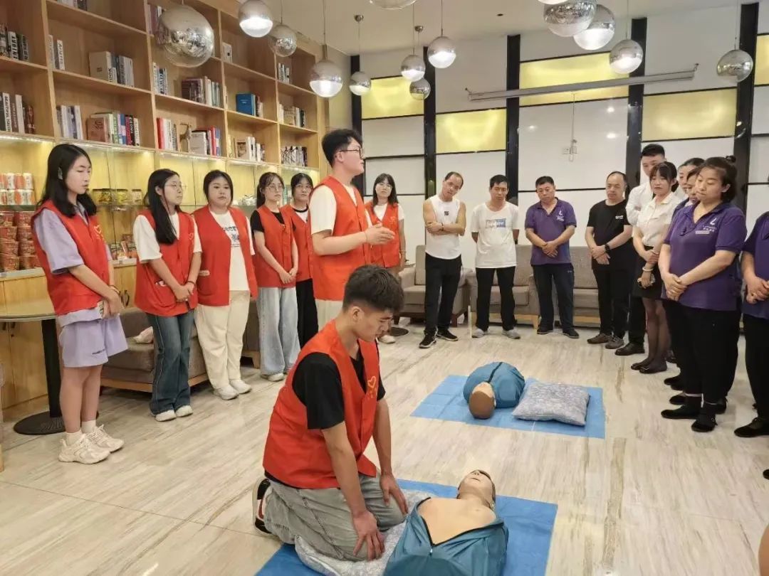 下午3:40,志愿队队员前往正东社区的麓枫酒店,为酒店的工作人员宣讲心肺复苏和海姆立克急救法。宣讲过程中杨超、杨邵焜、冯荷梦三位同学用“剪刀,石头,布”的小妙招,为在场人员讲解了海姆利克急救法,并解答了大家的相关疑问。队员们的耐心讲授,获得酒店工作人员的一致好评。