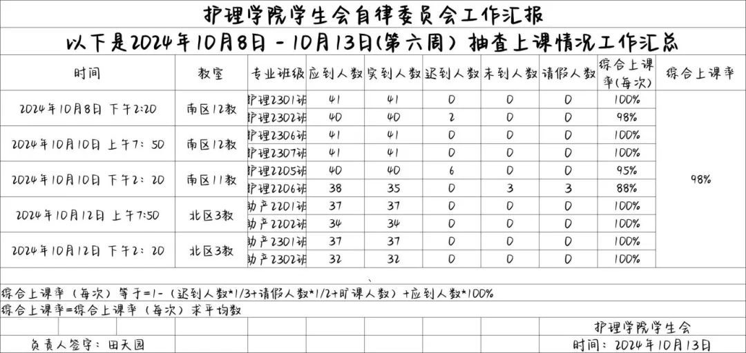现公示第六周(10月8日-10月13日)beat365唯一官网员工会自律委员会查课迟到情况。