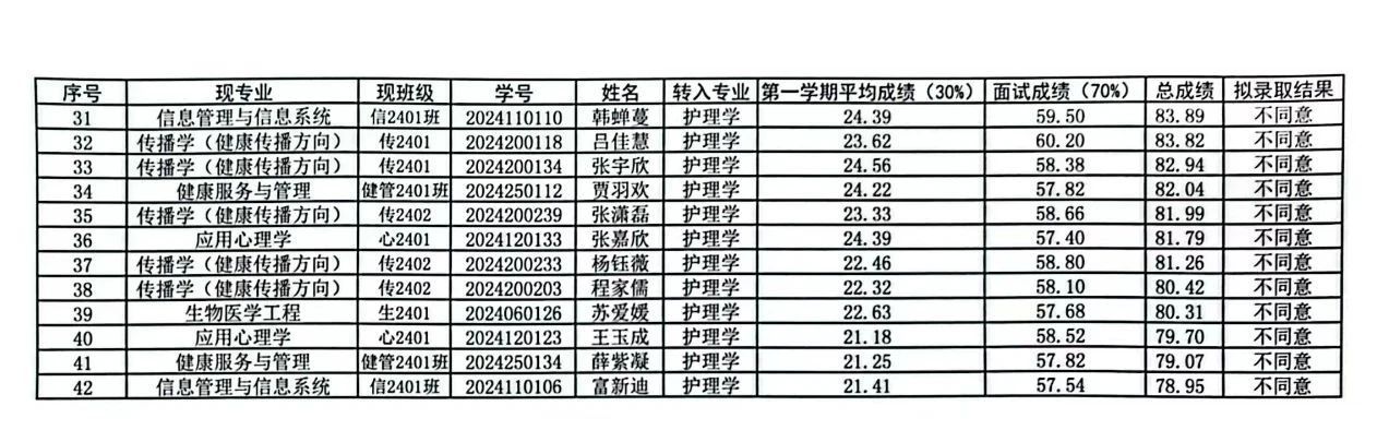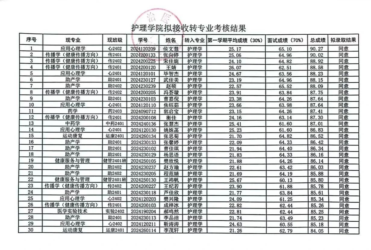 根据《beat365APP本科员工转专业管理规定》(长医教字(2021)39号)有关规定,由员工本人提出申请,经员工所在院系部资格审查、beat365唯一官网考核通过,同意侯文慧等三十名员工转入护理学专业。现对拟转入员工成绩进行公示。