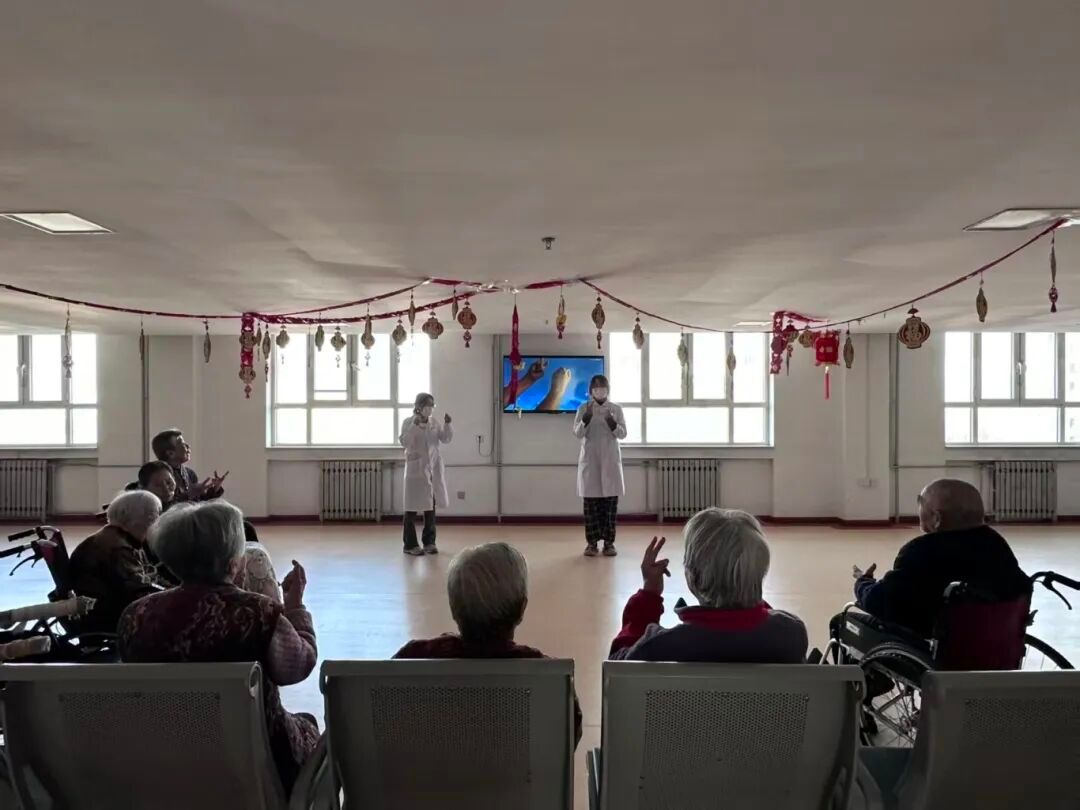 活动伊始,5个小组各自前往对应楼层,带领老人们开展适配性锻炼。在“活力银龄健身环节”中,同学们结合老人身体特点,带领他们做“椅子健身操”,从肩部环绕、手腕活动到下肢屈伸,每个动作都放慢节奏、耐心示范。同时,同学们穿插讲解安全知识,让锻炼与健康知识同步传递。接着,各小组前往3楼活动大厅开始展演环节,既有悠扬轻快的歌声,还有舒展柔和的舞蹈,现场氛围热烈欢快。活动最后,侯玲老师组织各组进行心得体会总结,分享和老人相处的暖心瞬间。