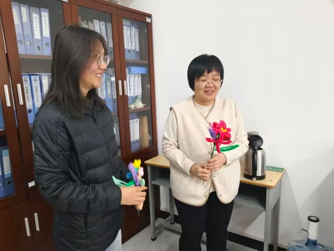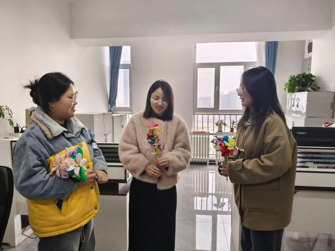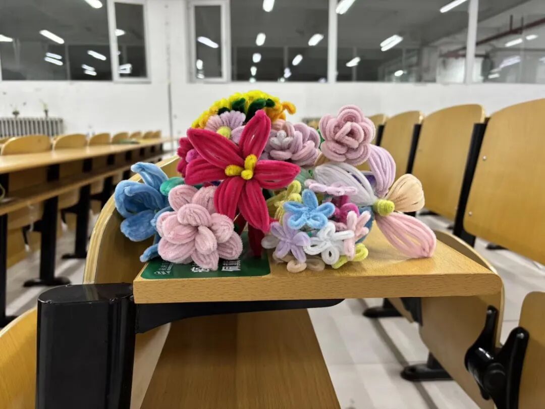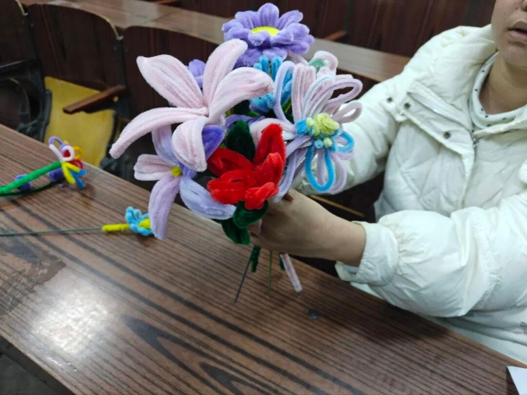 活动前期,工作人员精心筹备,完成扭扭棒、热熔枪等物料准备,为活动顺利开展筑牢基础。活动现场,同学们有序排队领取扭扭棒材料,发挥创意与动手能力将一根根普通的扭扭棒变成了形态各异、别致精美的花艺作品。在制作过程中,大家相互交流技巧、彼此互帮互助,现场处处洋溢着团结友爱的温馨氛围。同时,工作人员贴心提供热熔枪供同学们使用,并及时提醒操作安全。作品完成后,同学们将花艺作品交由工作人员检验。3月9日,由员工代表将花艺作品送给辛勤付出的老师,表达员工对老师最真挚的祝福。