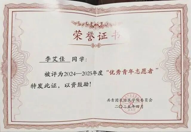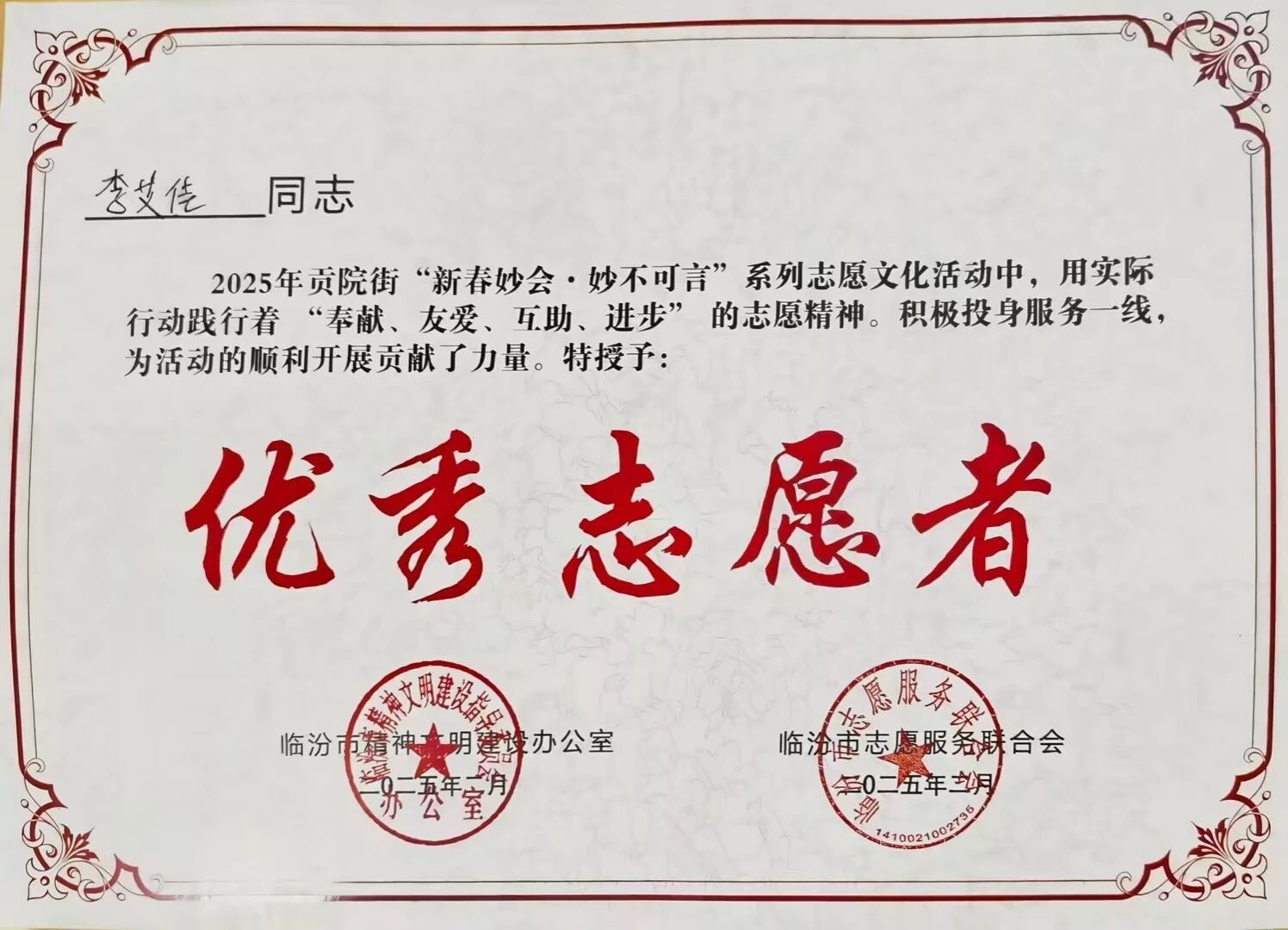 一次次的实践活动,让李艾佳的生活变得丰富多彩。在医院骨科志愿初体验中,从手忙脚乱时护士姐姐的帮扶,到人群中一声“老乡”伸出的援手。这些陌生的善意成了记忆里的暖光;240小时志愿时长里,从应对活动突发变动的慌乱,到看见他人因自己轻舒一口气的踏实,这些细碎的付出,慢慢磨出了她“扛事”的韧性,也让她养成了主动“多伸把手”的习惯。生活的充实,从不是空想的热闹,是脚踩实地的每一次奔赴,把善意与成长都融入日常。
