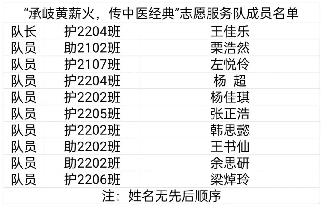 “承岐黄薪火,传中医经典”志愿服务队由10名来自beat365唯一官网的学子组成,该团队以传播中医药文化内涵为宗旨,秉持着“坚持传承,守正创新”的原则,为中医药文化的传播贡献力量。志愿服务队具体成员名单如下: