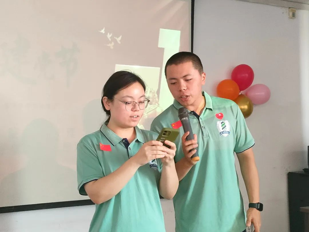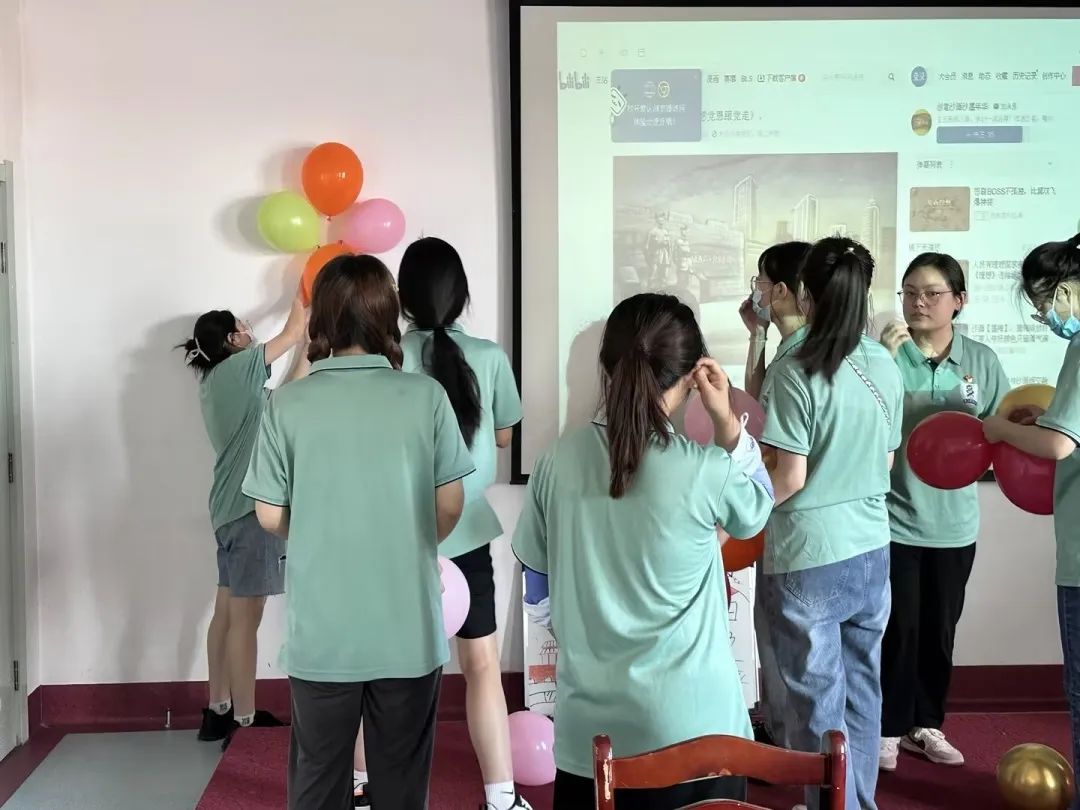 在指导老师的带领下,队员们紧锣密鼓地布置活动场地——粘贴气球、摆放桌椅、画黑板报,为受邀参加活动的爷爷奶奶们发放国旗党旗,并为他们粘贴国旗爱心贴画。