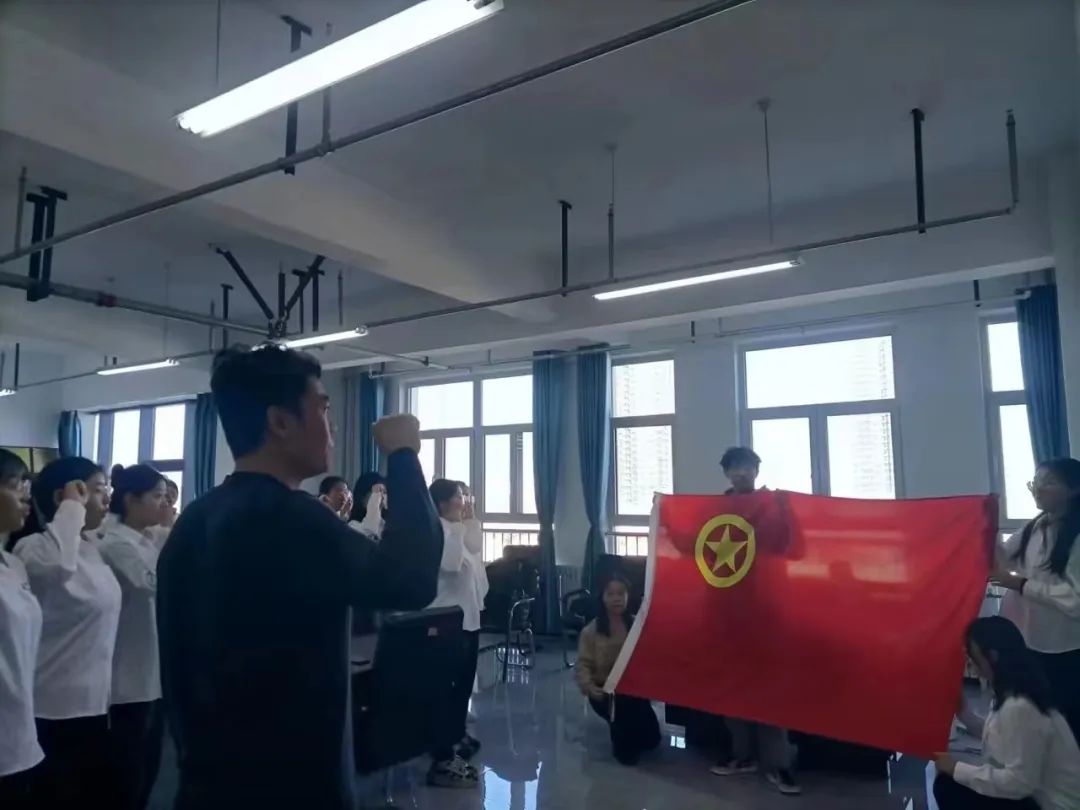 在谢冰老师的领誓下,全体团员面向团旗进行集体宣誓。同学们目光坚定,声音铿锵有力,每个字都充满了力量和信念。诠释了对祖国的忠诚,展现了新时代青年奋发向上的精神面貌和建设新时代的昂扬斗志。