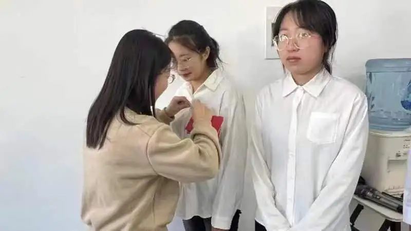 谢冰老师和正式团员代表为新团员佩戴了团徽。这一小小的徽章,镌刻着团旗、齿轮、麦穗,如同初升的太阳,时刻提醒我们铭记自己的团员身份,坚定理想信念,继承和发扬共青团的精神和使命,朝着党所指引的方向奋勇前进。