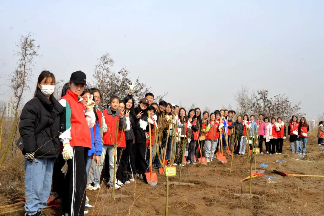 植树过程中,大家互相帮助,挖坑,放树苗,填坑,浇水,师生四人一组共同种下一棵棵带着希望的树苗,它们将带着我们对碧水蓝天的向往扎根在这片土地上,结束后大家还给自己种下的小树苗起了名字,并拍照留念。
