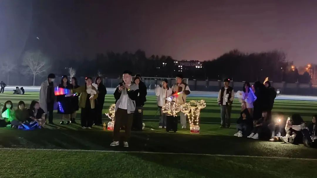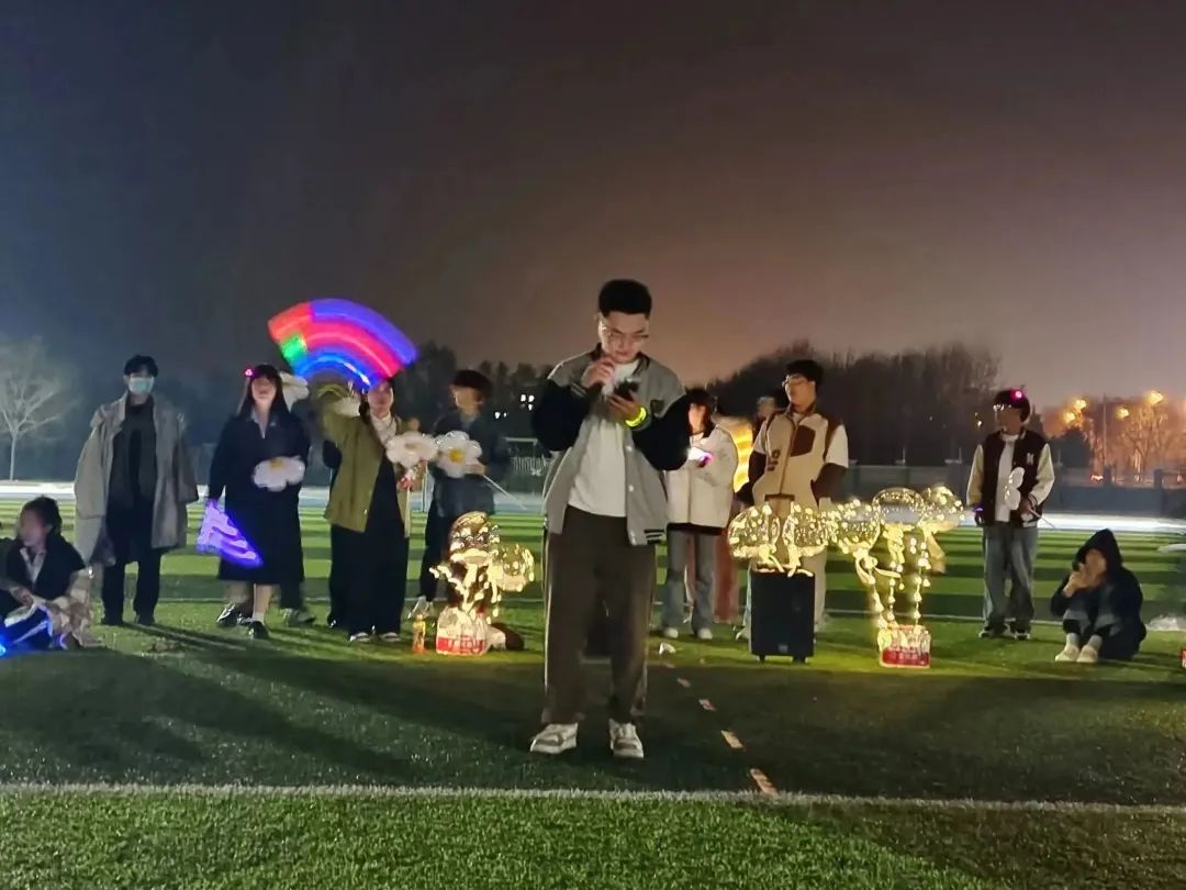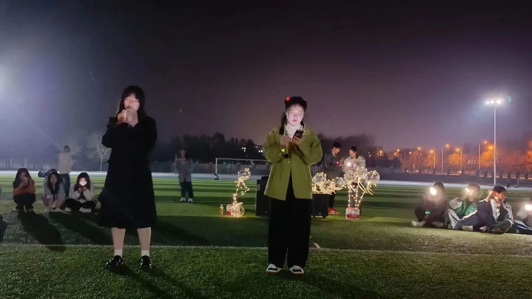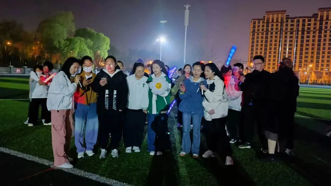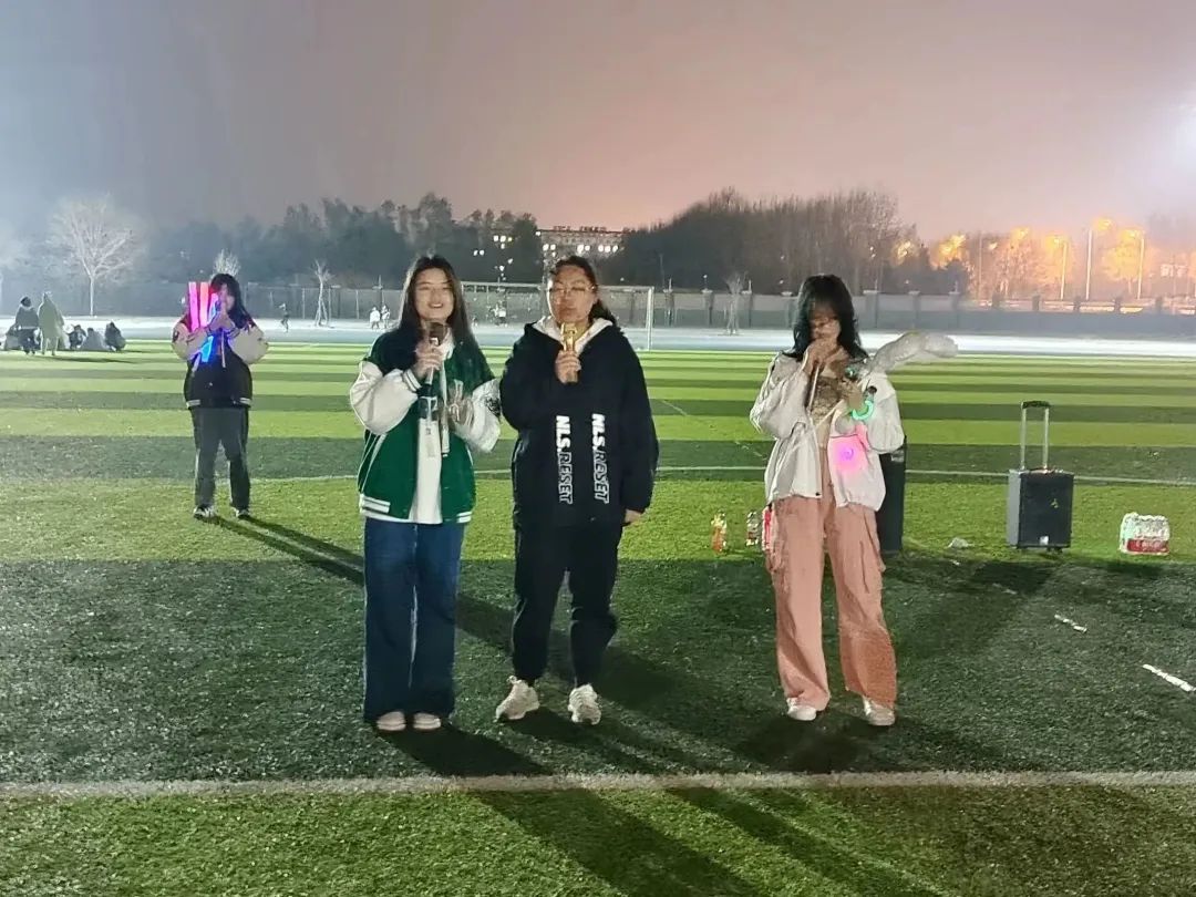 19:30活动准时开始,动感的音乐,饱满的热情,同学们放声歌唱,曼妙的歌声载着青春的旋律飘向操场上方;互动小游戏引得全场沸腾,使现场气氛达到高潮;最后大合唱《当》和《仰望星空》体现着同学们奋发向上、活泼开朗的青春底色。