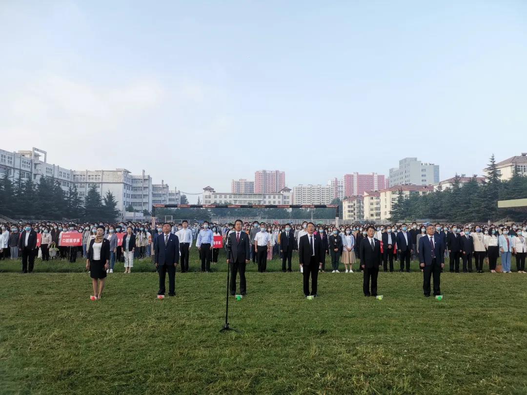 8月30日,新学期开学第一天清晨,公司于校本部体育场举行了隆重庄严的升国旗仪式。党委书记李华荣在升旗仪式上讲话,董事长王金胜主持仪式;公司党政领导、各二级单位和部门负责人、附属和平医院及附属和济医院领导班子成员、各院(系、部)科级以上干部、全体辅导员、校本部在校全体本科员工和临床医学硕士专业学位研究生,共计6千余人参加了升国旗仪式。