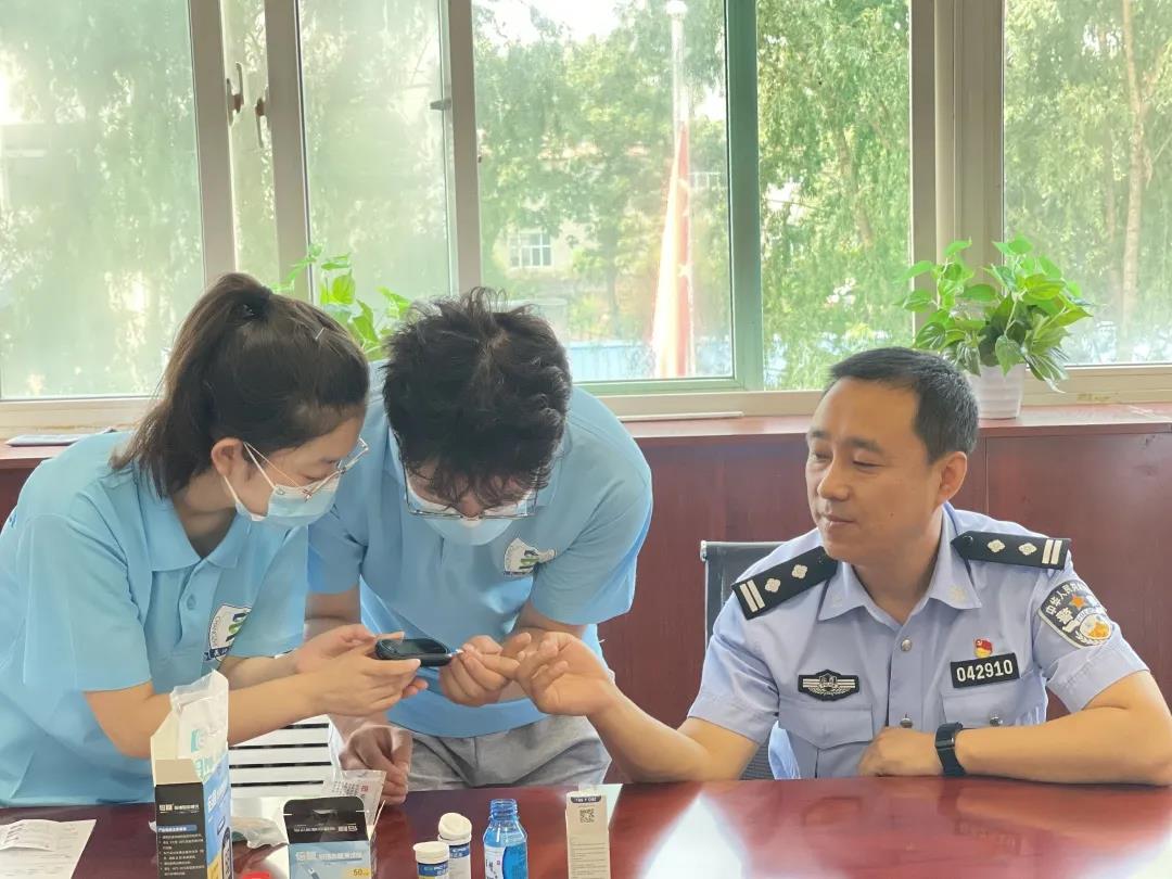 讲解结束后,南丁格尔志愿服务队为在场的民警们量血压、测血糖,并告诉他们血压、血糖的正常范围,张静老师认真回答民警们的疑难困惑。