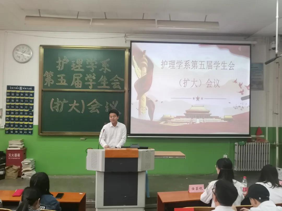 会议由主持人任芸锐宣布开始,全体参会人员起立奏唱国歌。首先,护理学系员工会主席张江泽以一首《我的祖国》开场,上台做工作汇报,他指出作为一个员工干部要时刻坚定自己的立场,每个人在新的学期要认真工作。