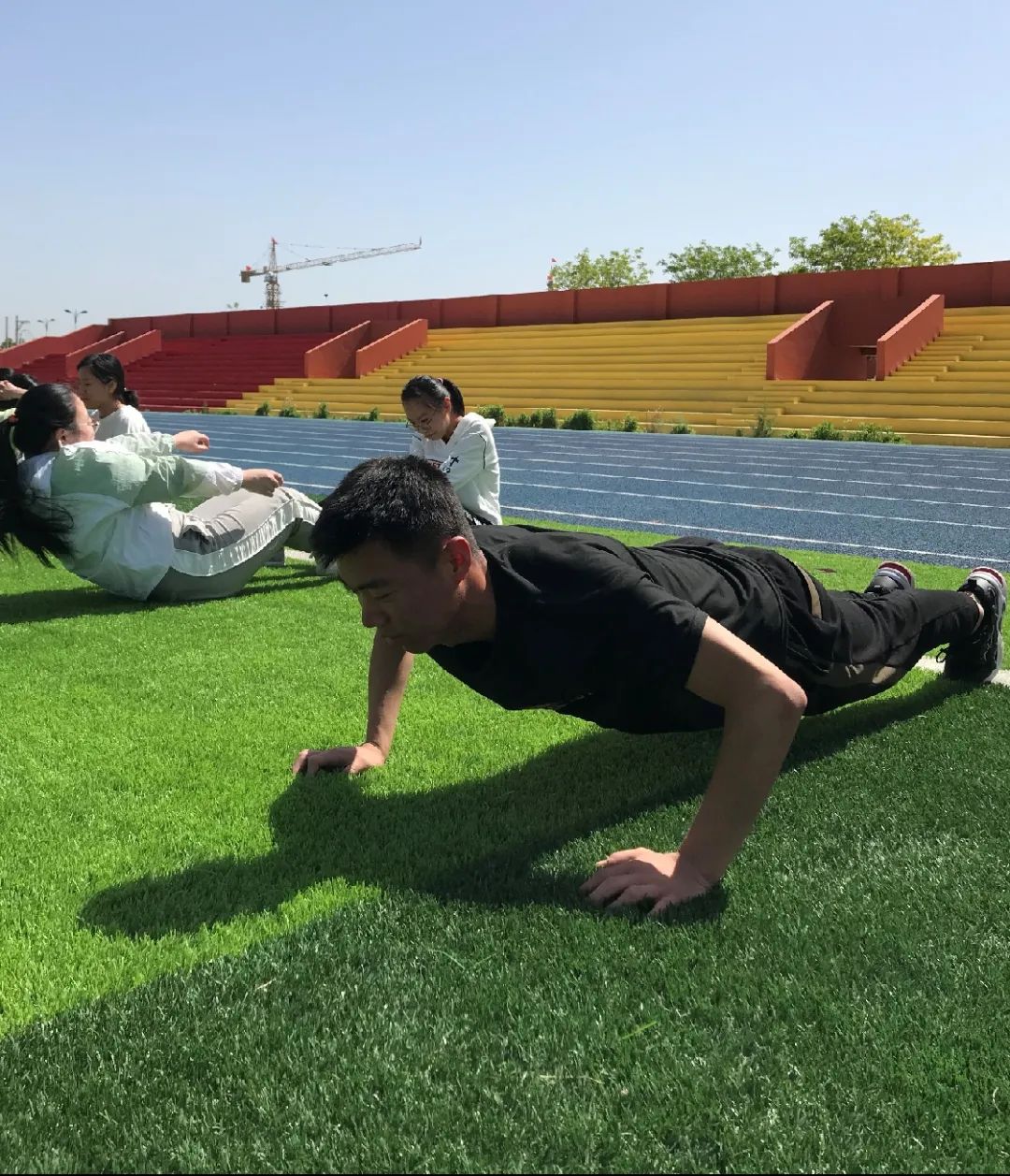 首先是两分钟的热身跑步,同学们的完成情况良好。伴随着音乐,每组20个共3组的开合跳、3组高抬腿、3组仰卧起坐,让同学们充分地拉伸了全身的肌肉。接下来进行的接力赛跑,同学们你追我赶,勇往直前,奋力进发。最有意思的莫过于踢毽子比赛和踢足球比赛。虽然大部分是女同学,但是她们的激情和热情绝不比男同学们差。炎炎夏日,同学们一个个都大汗淋漓,悉心的辅导员老师买来了西瓜让大家解暑。