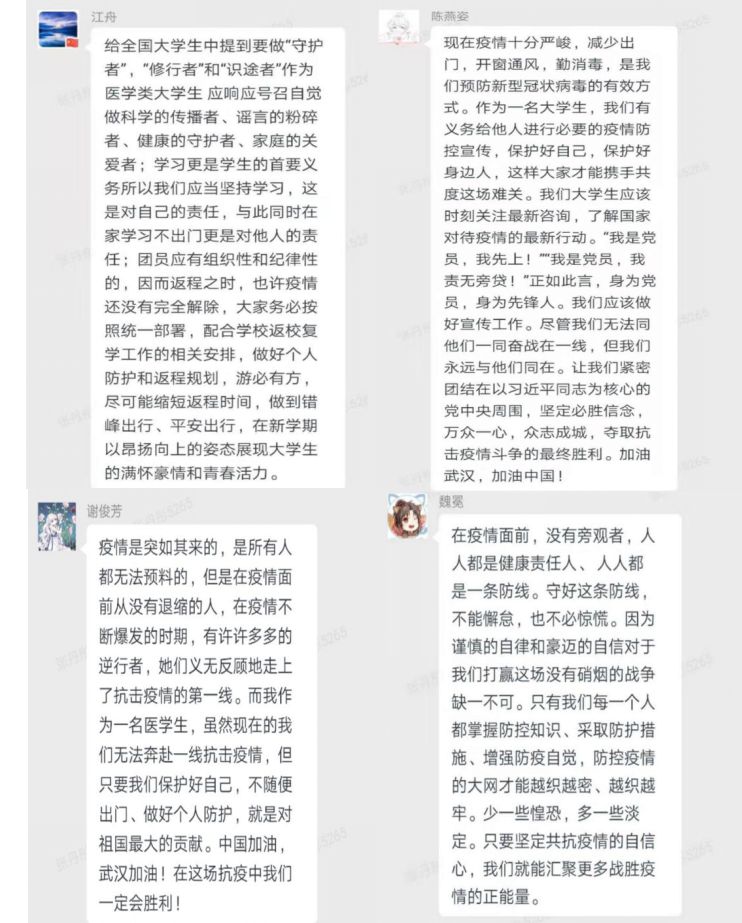 班会上,同学们一起认真学习了《教育部致全国老员工的一封信》,围绕“在疫情期间,一名老员工应该如何做?一名共青团员应该如何做?如何做好守护者、修行者、识途者?”展开讨论,同学们积极表达自己的看法、畅所欲言。在发言期间,大家就当代老员工和共青团员责任的重大性展开了激烈讨论,并结合自身情况以及对疫情的了解争先发言,纷纷表示将肩负起时代赋予的使命,坚定与人民共患难,与祖国同命运的决心;保持好心态、重防护、勤消毒、减少出门和聚会,为夺取抗击新型冠状病毒感染肺炎疫情斗争的胜利作出应有的贡献,就像《教育部致全国老员工的一封信》中所说的那样自觉做科学的传播者、谣言的粉碎者、健康的守护者、家庭的关爱者。