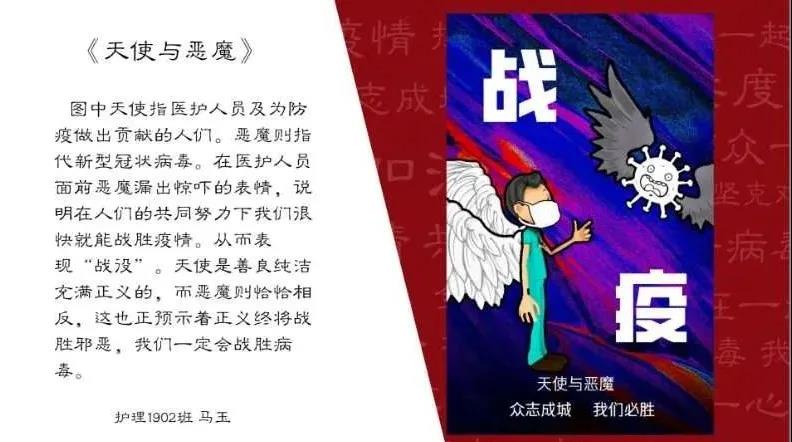 班会进行到第二项,主持人引导大家用自己的视角、语言、理解,通过“读”、“写”、“拍”、“画”、“创”等方式,展示自己心中的战“疫”印象。随后主持人选取了其中较为优秀的作品以PPT的形式向同学们展示,在增强班级凝聚力的同时,更加深同学们对“四个自信”、“众志成城”和职业精神的理解。