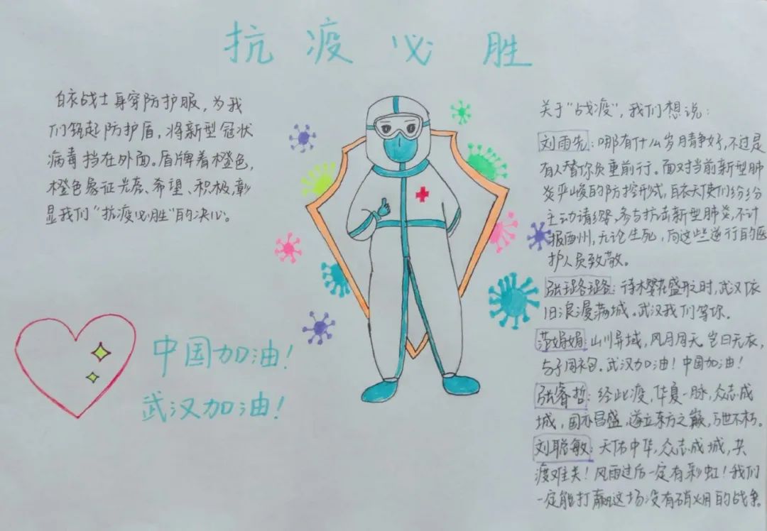 接下来,同学们通过绘画、剪辑的视频、优美的文字向我们展示了他们对逆行者们的尊敬。
