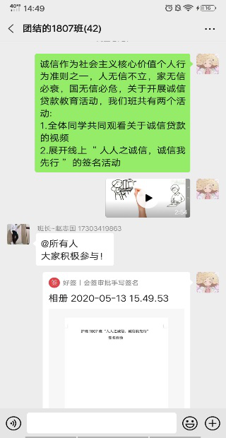 在诚信“云签名”活动中,同学们以“举牌拍照”或“小视频”的形式,郑重地签下了自己的名字。营造“人人知诚信,诚信我先行;战‘疫’必胜,诚信同行”的氛围,让诚信深入每一位同学的内心,成为每一位同学宝贵的无形资产。