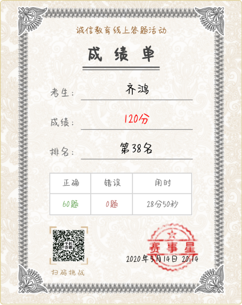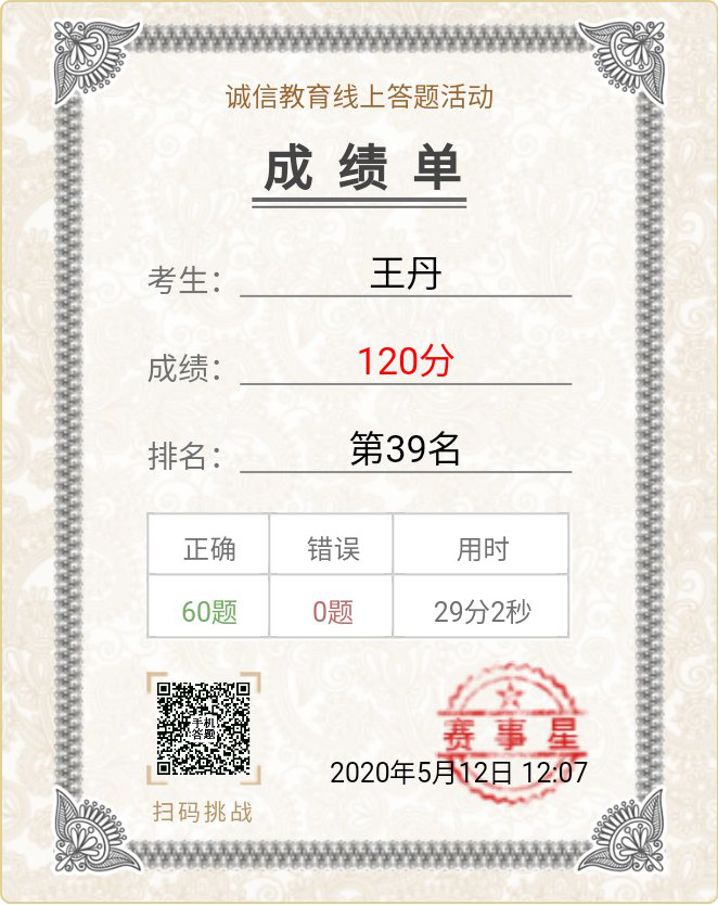 在诚信教育线上答题活动中,同学们积极报名踊跃参加。通过线上答题,让同学们灵活运用所掌握的诚信知识,更进一步加强同学们对征信知识的认识和学习。