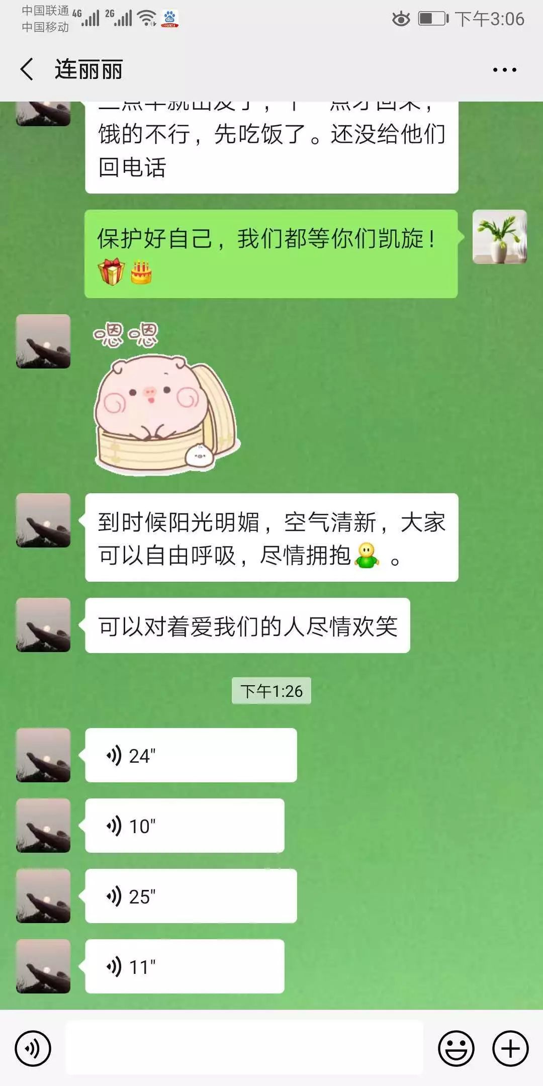 最后,我想用丽丽在微信里的一句话结束 “疫情过后,阳光明媚,空气清新,大家可以对着爱我们的人尽情欢笑!”