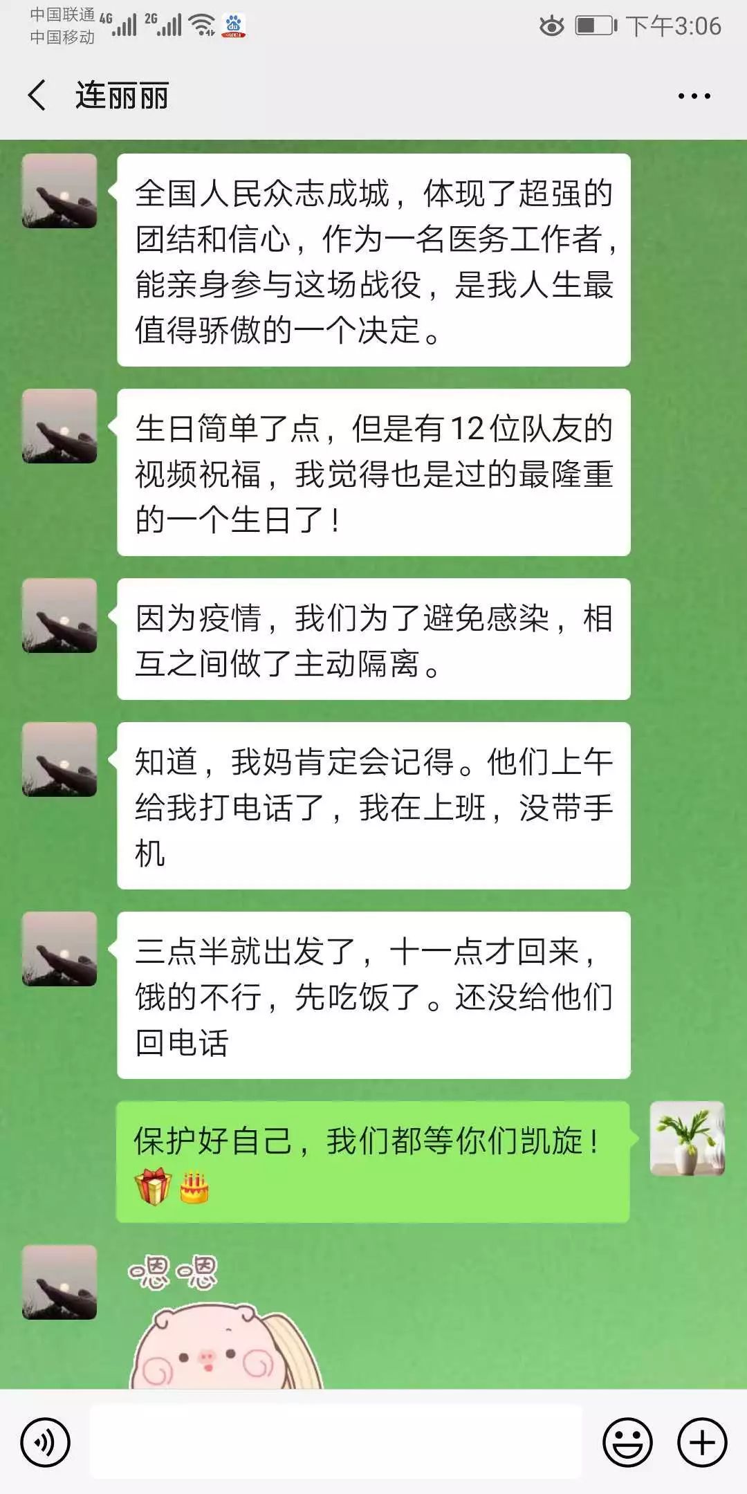 她在微信中说:“生日是简单了点,但是有12位队友的视频祝福,我觉得也是过的最隆重的一个生日了!”我没有理解,她解释说:“因为疫情,为了避免感染,相互之间做了主动隔离。”我安慰她说:“你在最危险的疫情前线,没有朋友和家人陪伴,要调整好心态。”她说:“作为一名医务工作者,能亲身参与这场战役,是我人生最值得骄傲的一个决定!”我们还聊了很多。听得出来,她的心态很阳光!
