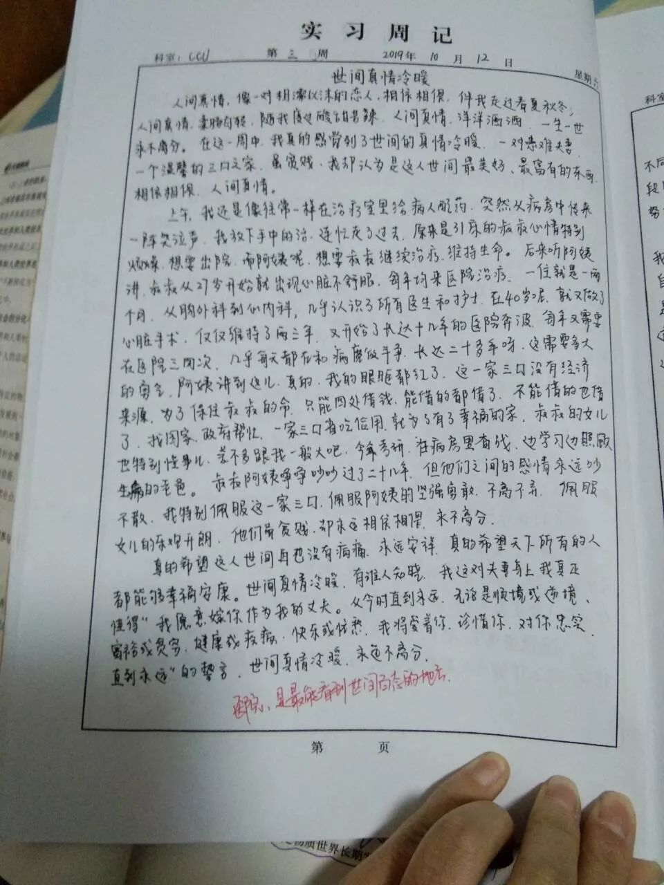 心与心之间的距离,有时候就是这么奇妙,在今后的护理工作中,我仍然将温暖传递给更多的病人,贴近心与心的距离,担起天使的责任,让温暖撒满人间,用我们的真心为病人撑起一片蓝天!加油!