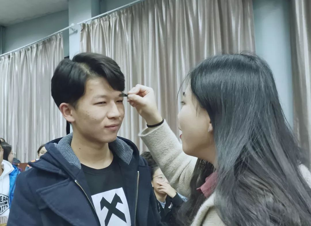 在互动环节中,男女同学配对成组,在规定时间内相互化妆,四组PK,选出最会化妆的男生和女生各一名。接下来,1807班的张馨元同学从仪态美、容貌美和内在修养美为切入点,向大家展示了中国女兵“枪操仪式”的表演视频,带大家重温了新中国70华诞阅兵式的精彩片段。