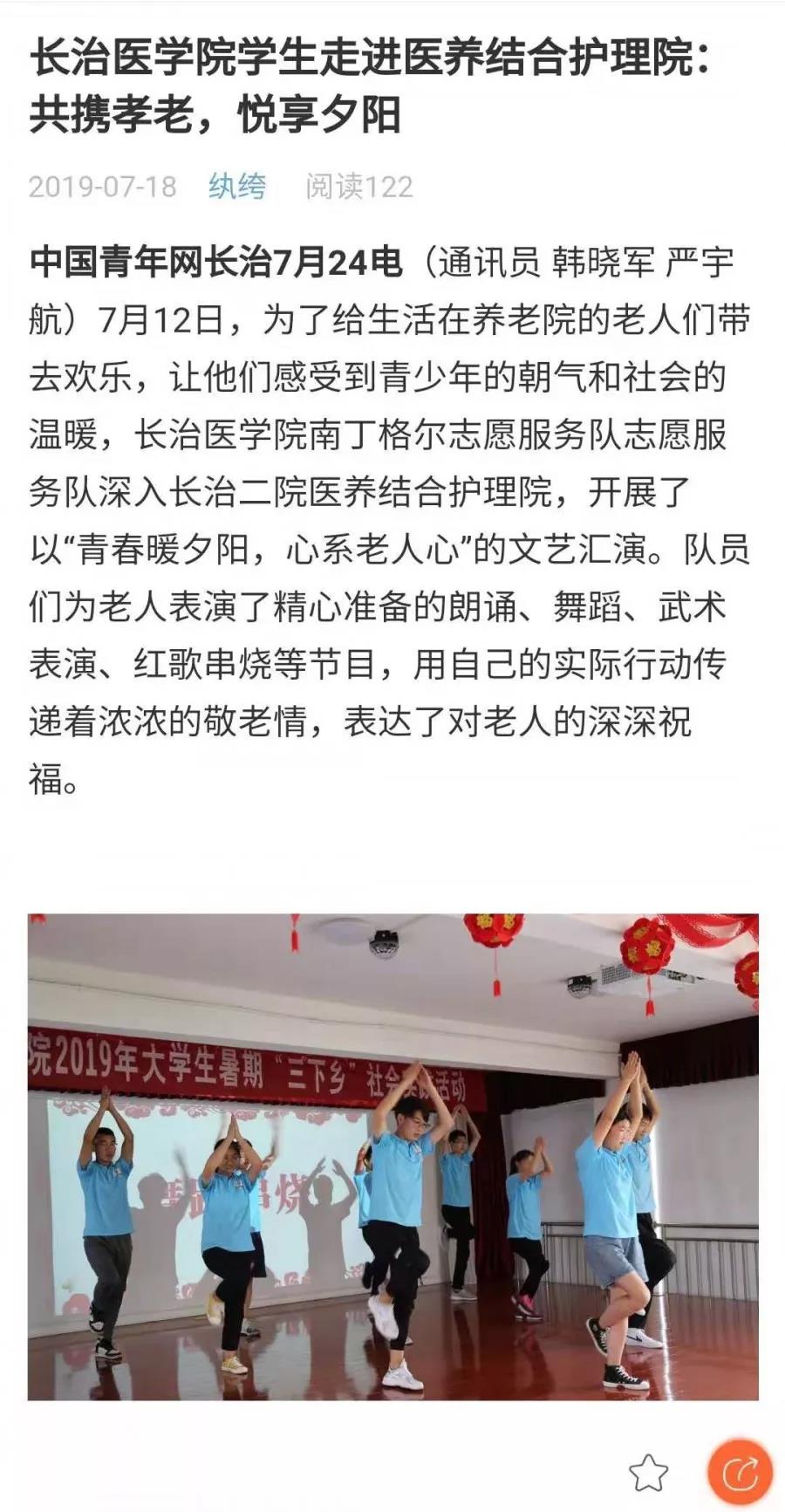 护理学系南丁格尔志愿服务队,在护理学系分团委副书记谢冰老师与护理学系副教授赵文婷老师的带领下,赴长治市第二人民医院医养结合护理院,开展为期一周的老员工暑期三下乡社会实践活动。