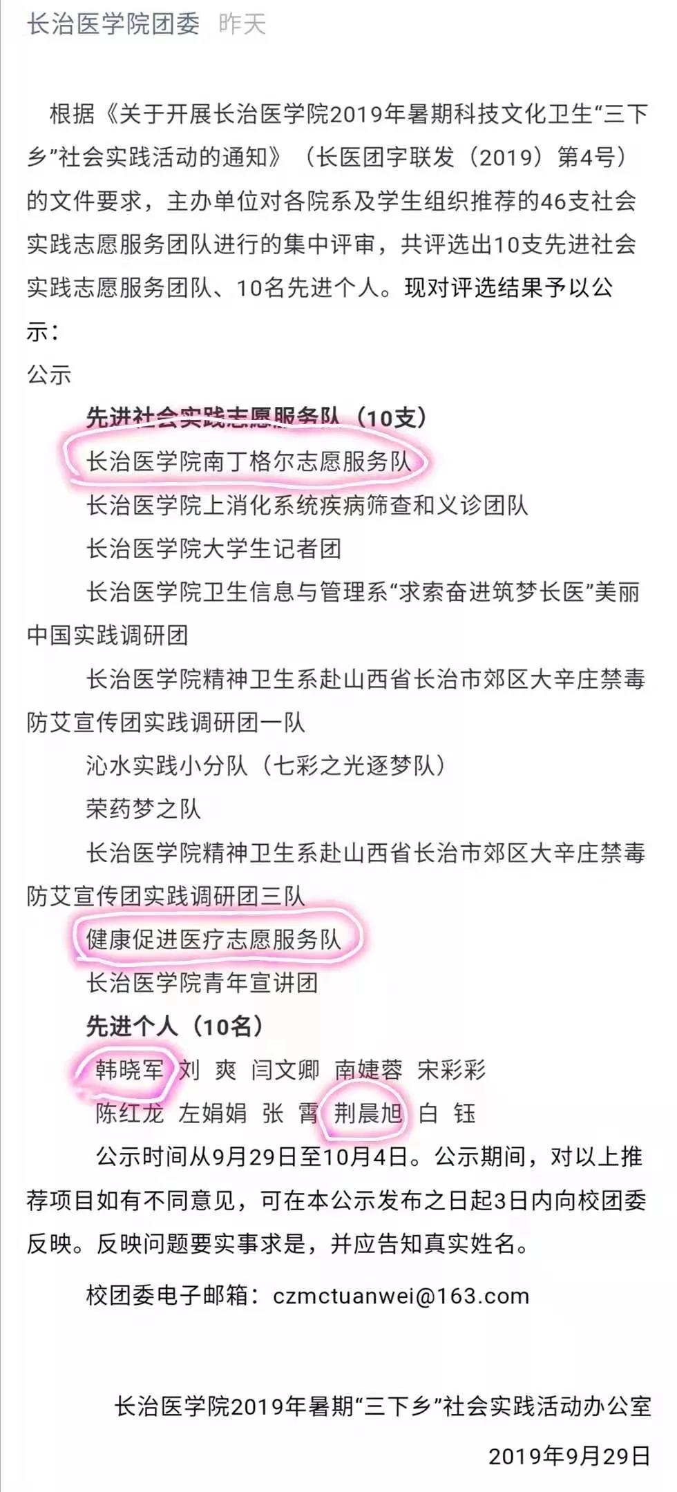 在beat365APP2019暑期科技文化卫生“三下乡”社会实践活动评审中,护理学系健康促进医疗志愿服务队荣获beat365APP“先进社会实践服务队”称号,荆辰旭获“先进个人”称号。
