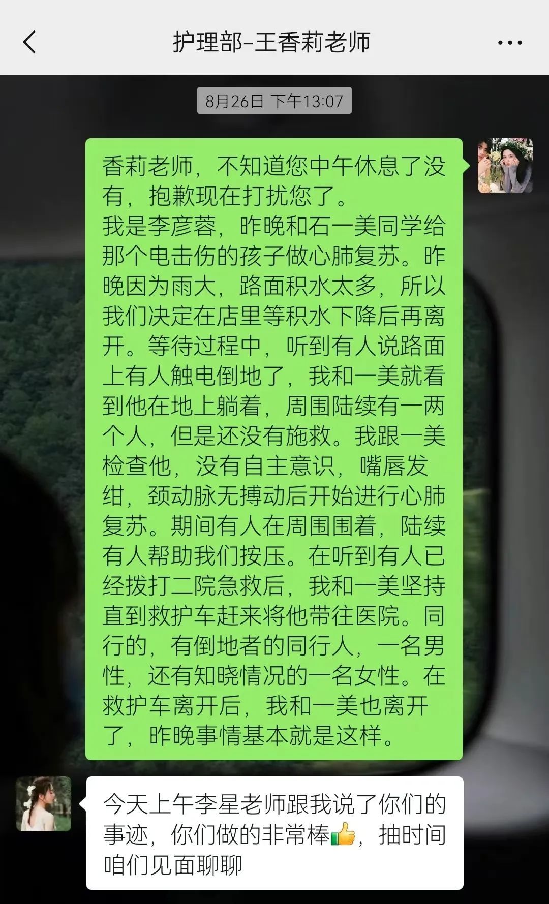 她无私奉献,乐于助人,曾于实习期间抢救过一位心脏骤停的孩子。当时正值夜晚,外面下着倾盆大雨,李彦蓉和同伴在餐厅里等待积水消退。突然,他们发现一名男子昏倒在路面上,不省人事。李彦蓉立刻上前检查他的情况,并迅速采取心肺复苏措施,一刻不停地持续施救,直到救护车赶到现场。利用自己所学到的知识和技能,去帮助那些需要帮助的人,发挥出自己的价值,她感到非常自豪。