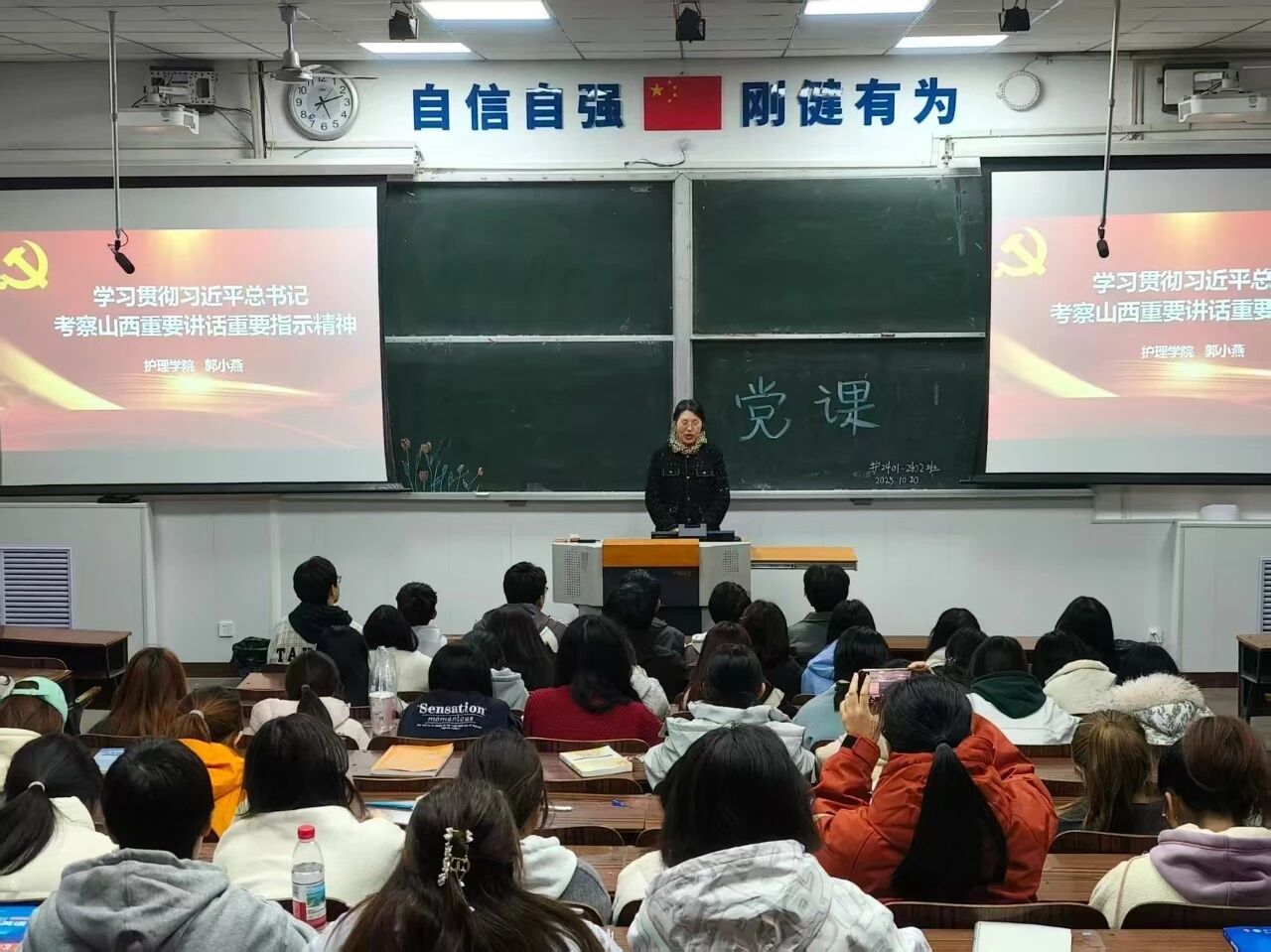 党课上,郭小燕紧扣习近平总书记考察山西重要讲话重要指示精神,紧密结合护理专业特点,用通俗易懂、生动鲜活的语言展开讲解。她从党的十八大以来山西在经济发展、社会民生、文化建设等方面取得的显著成就说起,自然过渡到护理专业学子的责任担当。她鼓励同学们要传承红色基因,汲取革命先辈们的精神力量,将爱国情怀与奉献精神融入到日常学习和未来工作中;要勇担护理使命,以精湛的专业技能、温暖的人文关怀,为患者提供优质护理服务,成为守护人民健康的白衣天使。大家深刻认识到,作为新时代的护理专业学子,不仅要掌握扎实的专业知识,更要具备高度的社会责任感和使命感。