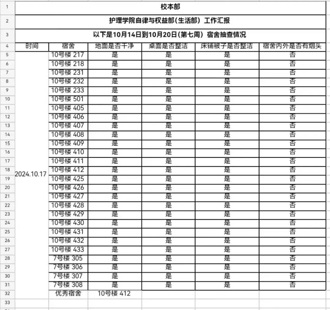 现公示第七周(10月14日-10月20日)beat365唯一官网员工会生活部查寝情况