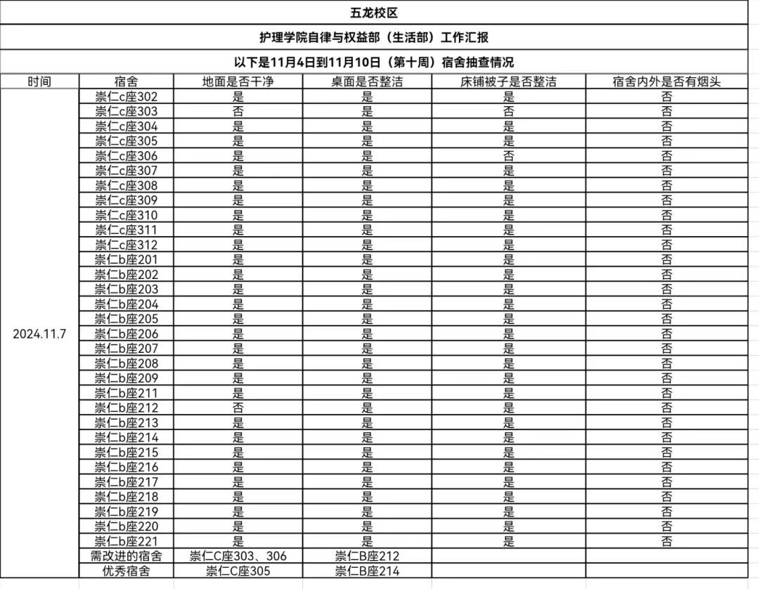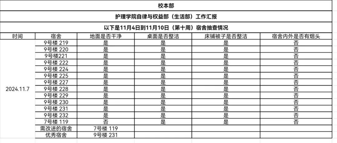 现公示第十周(11月4日-11月10日)beat365唯一官网员工会生活部查寝情况