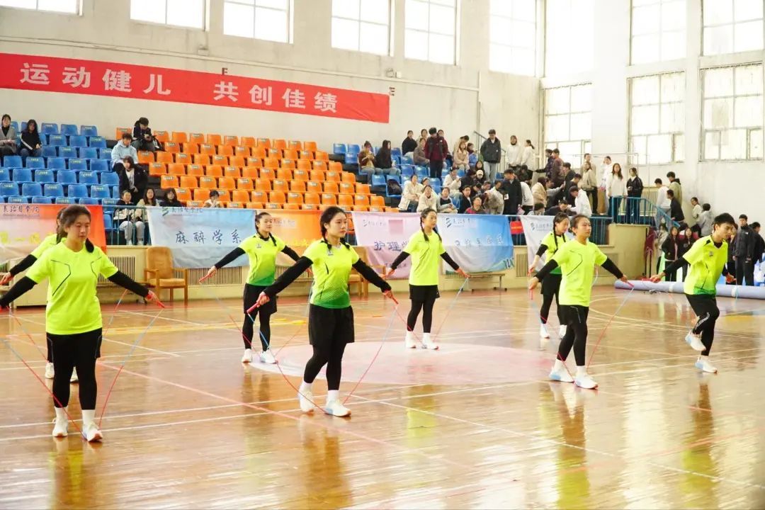 在一分钟七人长绳项目中,口腔医学系获得第一名,公共卫生与预防医学系、麻醉学系分别获得第二、三名。