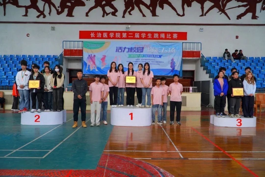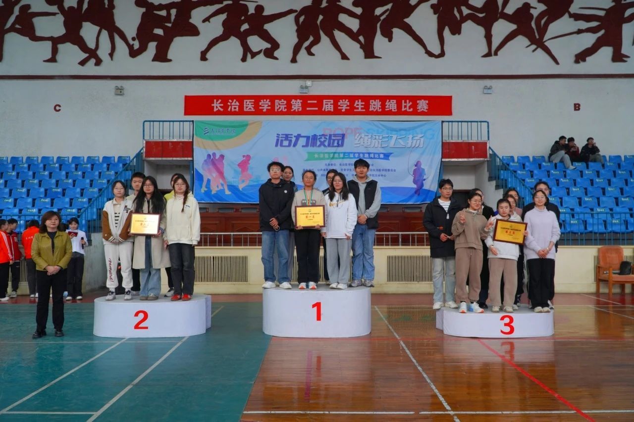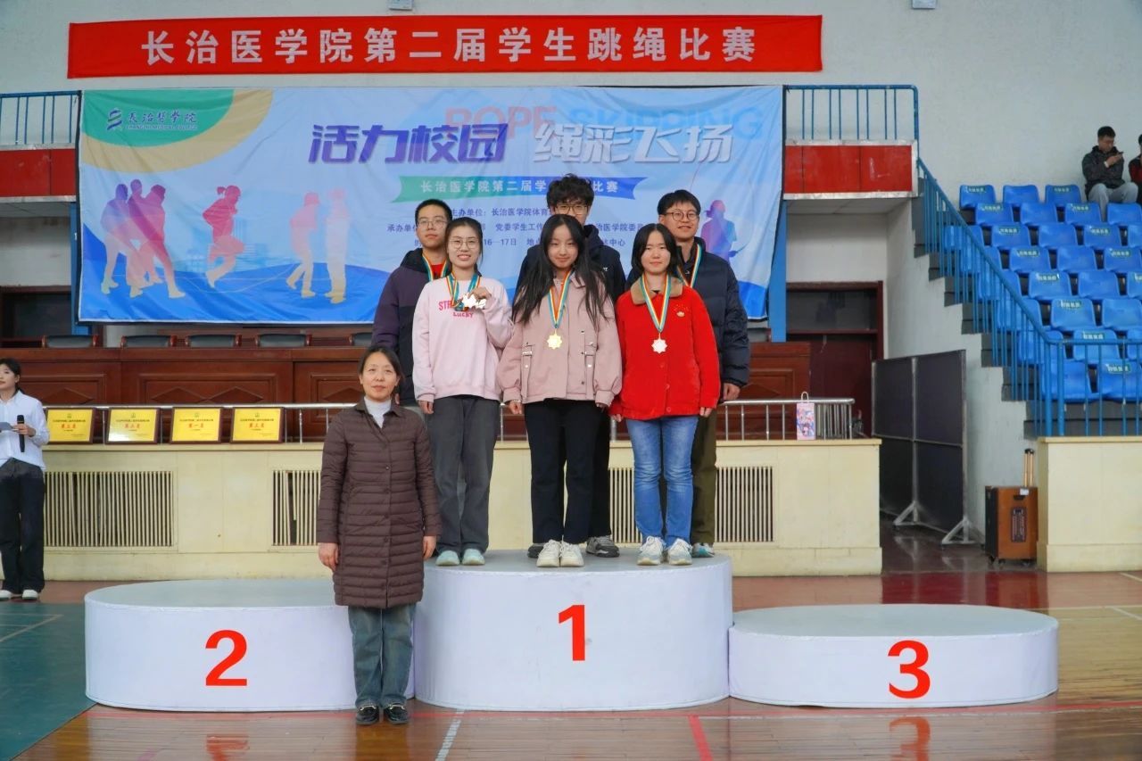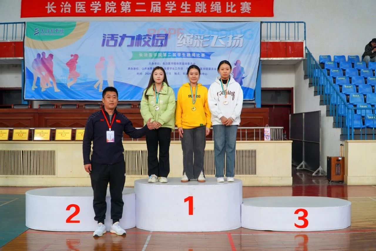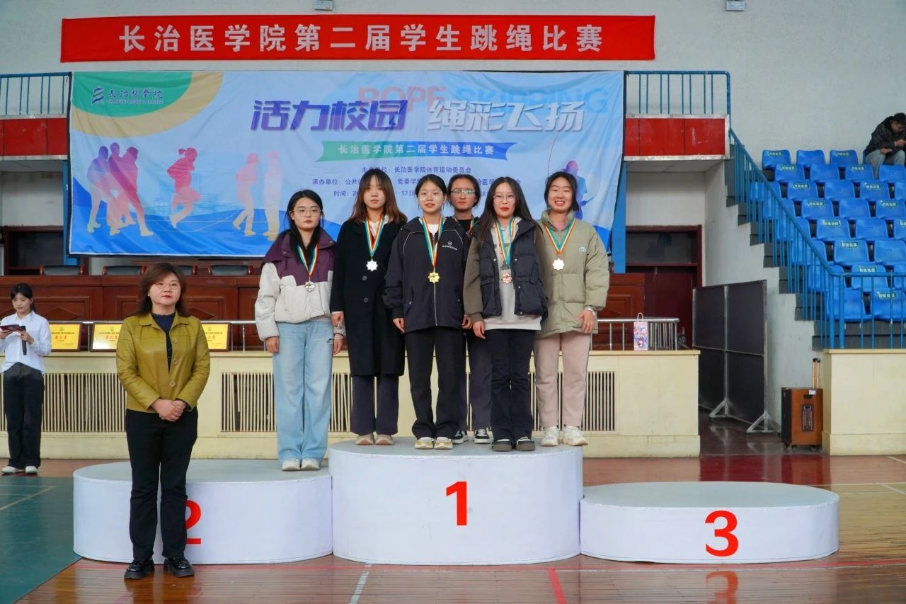 颁奖仪式上,公司跳绳队主教练张琦老师、公共体育部副主任赵岩、医学影像学系党总支副书记郜国叶、口腔医学系党总支副书记李丽婷为获奖选手颁奖。本次赛事最终获奖结果如下: