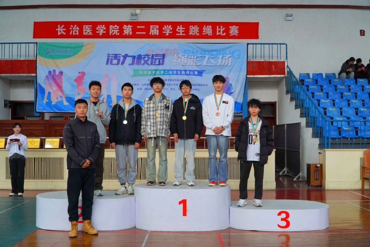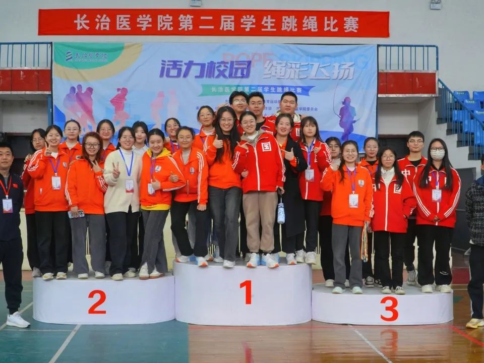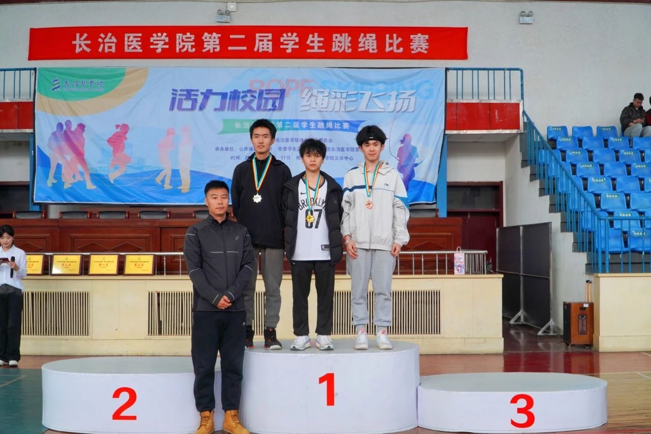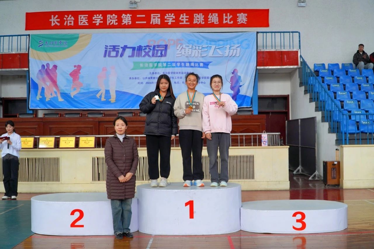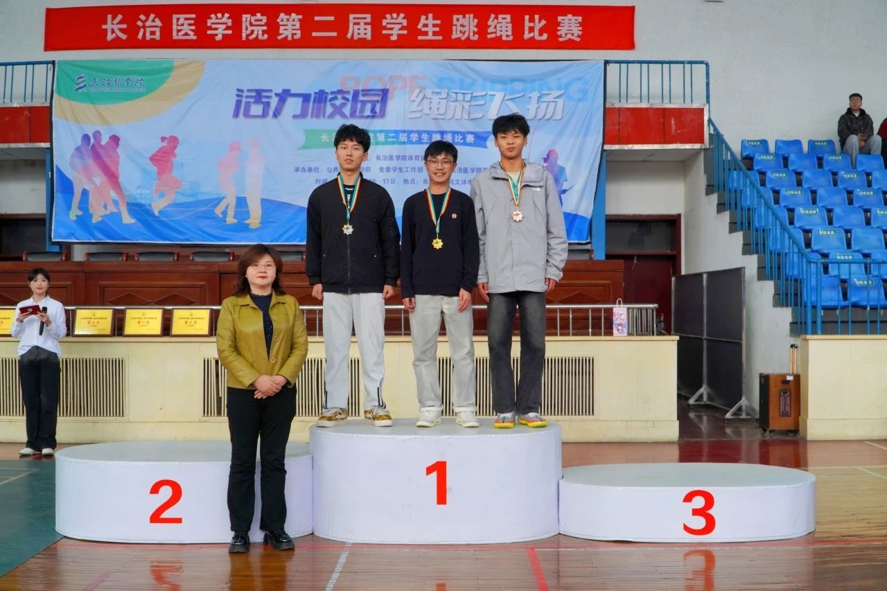 颁奖仪式上,公司跳绳队主教练张琦老师、公共体育部副主任赵岩、医学影像学系党总支副书记郜国叶、口腔医学系党总支副书记李丽婷为获奖选手颁奖。本次赛事最终获奖结果如下: