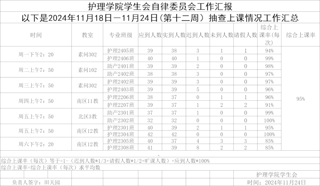现公示第十二周(11月18日-11月24日)beat365唯一官网员工会自律委员会查课迟到情况。