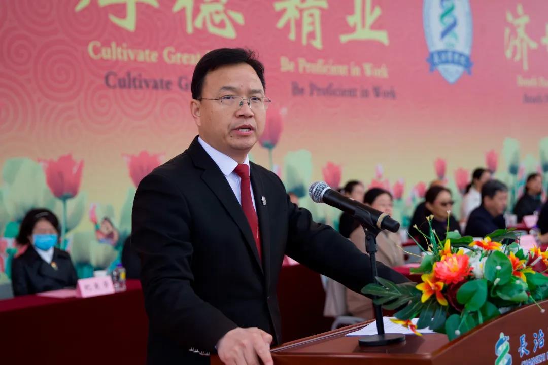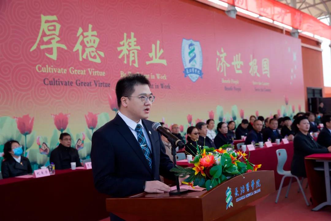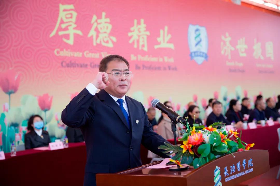 董事长王金胜对来自全国各地的新同学表示热烈欢迎,以《与更好的自己携手出发》为题发表了热情洋溢的讲话。他指出,2021年是充满荣光、写满梦想的一年。中国共产党历经风雨洗礼,迎来了建党100周年华诞,开启了砥砺初心向复兴的百年新征程。同学们告别中员工涯、步入大学殿堂,注定了要将学子的荣耀和伟大祖国的前途命运紧密相连,注定了要在实现中华民族伟大复兴的勇敢实践中放飞青春梦想,注定了要在新时代书写属于自己的精彩篇章。他和大家一起品读长医,深情回顾学校创建、发展、壮大的历程,回顾老董事长何穆先生的高尚品质和家国情怀,深刻解读长医“三大精神”,希望全体新生继承和发扬“长医精神”,让青春在不懈奋斗中绽放绚丽花朵。