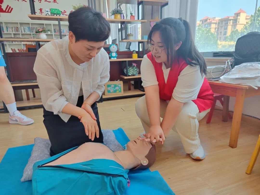 下午3:40,队员们为社区人员进行急救知识的宣讲。经过简单的布置后,马佳楚老师向社区居民们讲解了学习心肺复苏急救知识的目的和重要性。随后,由张佳怡主讲,杨奕配合演示,展示了心肺复苏的操作步骤和注意事项。在讲解过程中,两位同学耐心回答了居民提出的问题。宣讲结束后,社区居民踊跃参与心肺复苏按压练习,队员们一一耐心指导。最后,冯荷梦为社区居民讲解了如何在紧急情况下使用海姆立克急救法进行自救和救助他人。宣讲结束后,大家集体合影留念。