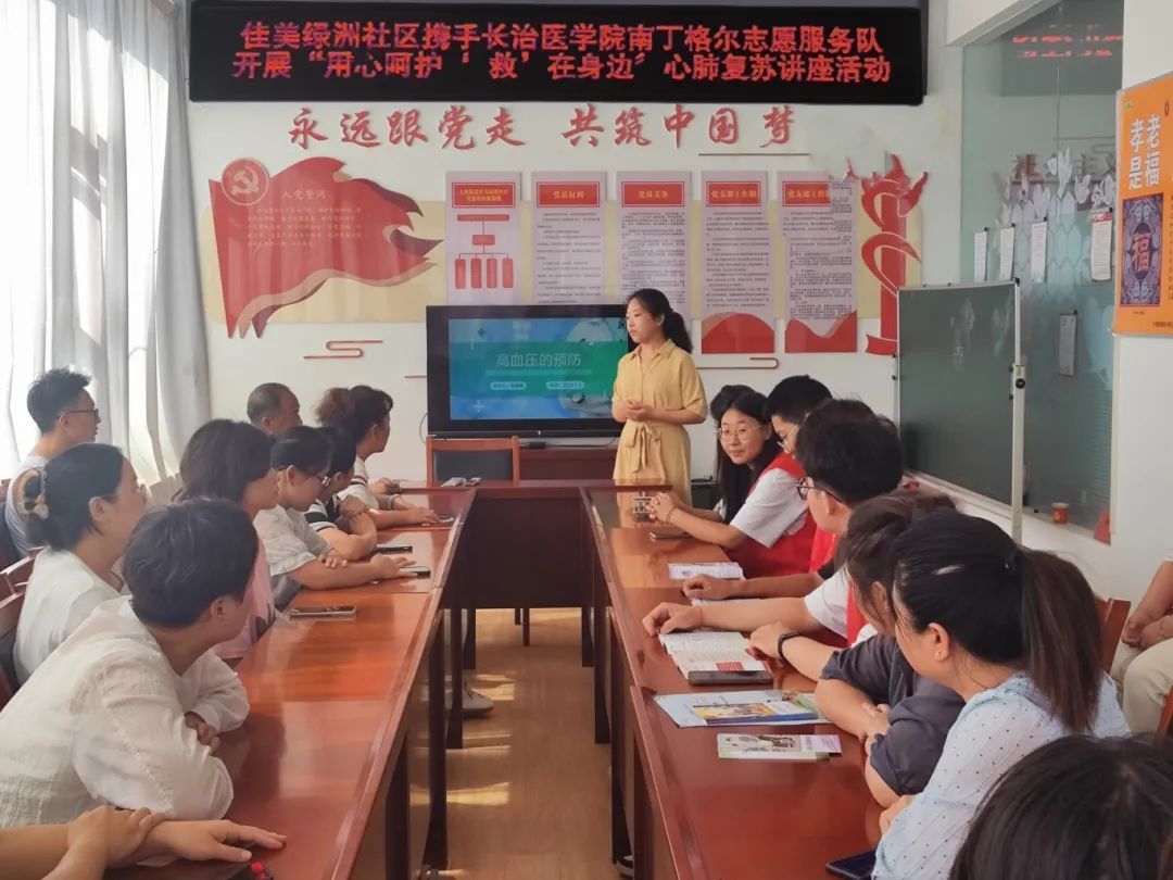上午9:30,大家在社区工作人员的带领下前往会议室开始高血压知识的宣讲。首先,马佳楚老师为大家介绍了本次宣讲的内容。接着,杨超宣读了“长治市文明礼仪规范”。随后,高嘉鑫为大家详细讲解了什么是高血压、预防高血压的重要性,以及如何在饮食方面避免高血压的发生。讲解结束后,马佳楚老师进行了补充总结,着重说明了高血压特殊情况的诊断标准和测量时的注意事项。最后,队员们为社区人员测量血压,并根据测量结果给予健康指导,圆满结束了上午的活动。