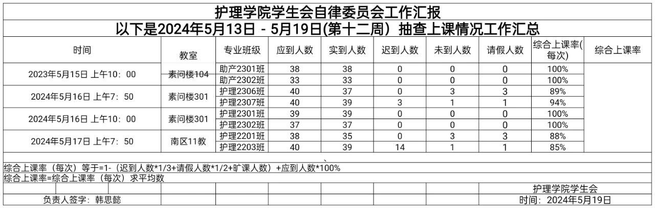 现公示第十二周(5月13日-5月19日)beat365唯一官网员工会自律委员会查课迟到情况。