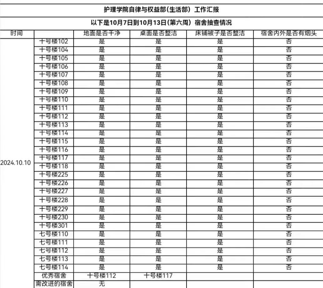 现公示第六周(10月7日-10月13日)beat365唯一官网员工会生活部查寝情况