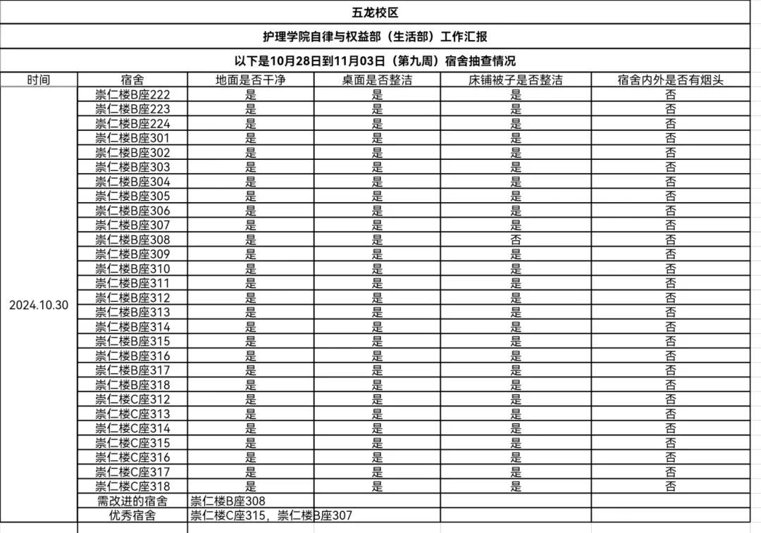 现公示第九周(10月28日-11月03日)beat365唯一官网员工会生活部查寝情况
