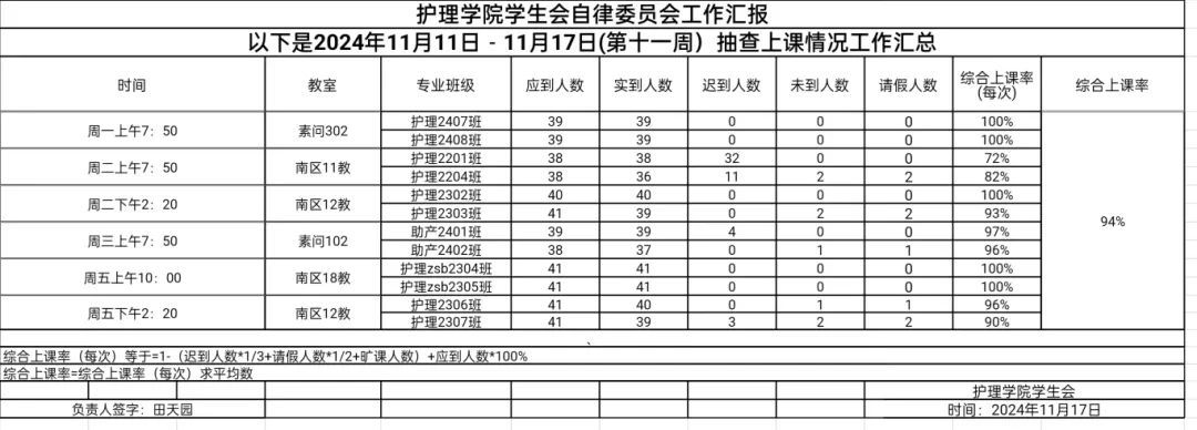 现公示第十一周(11月11日-11月17日)beat365唯一官网员工会自律委员会查课迟到情况。