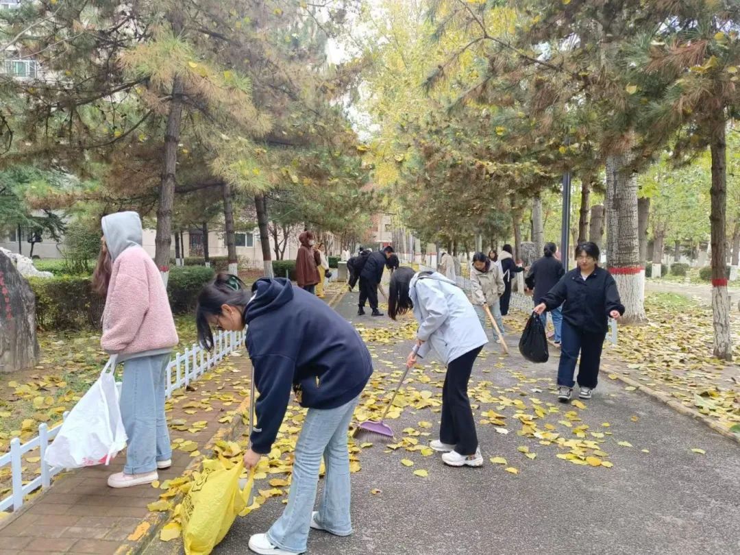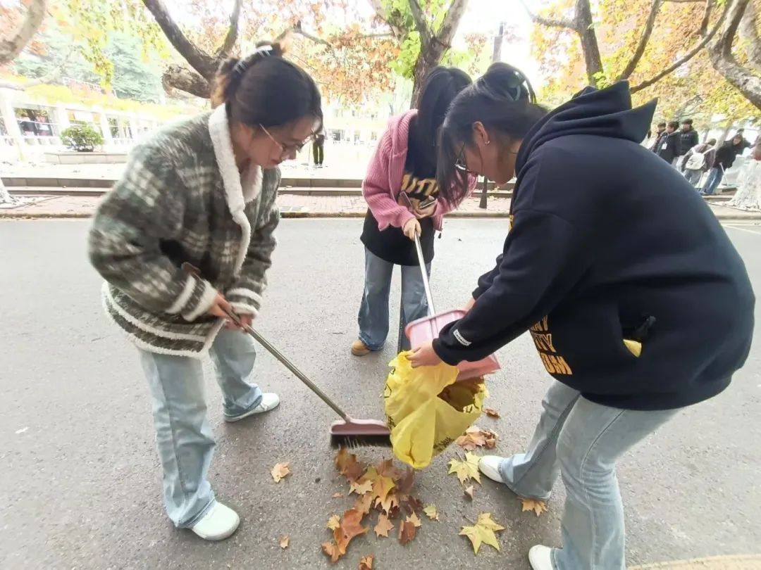 此次活动按照提前划分好的区域,以小组为单位进行落叶清扫。每位同学都干劲十足,不放过每个角落的每片落叶,大家互相配合,默契十足,整个清扫过程高效而有序。